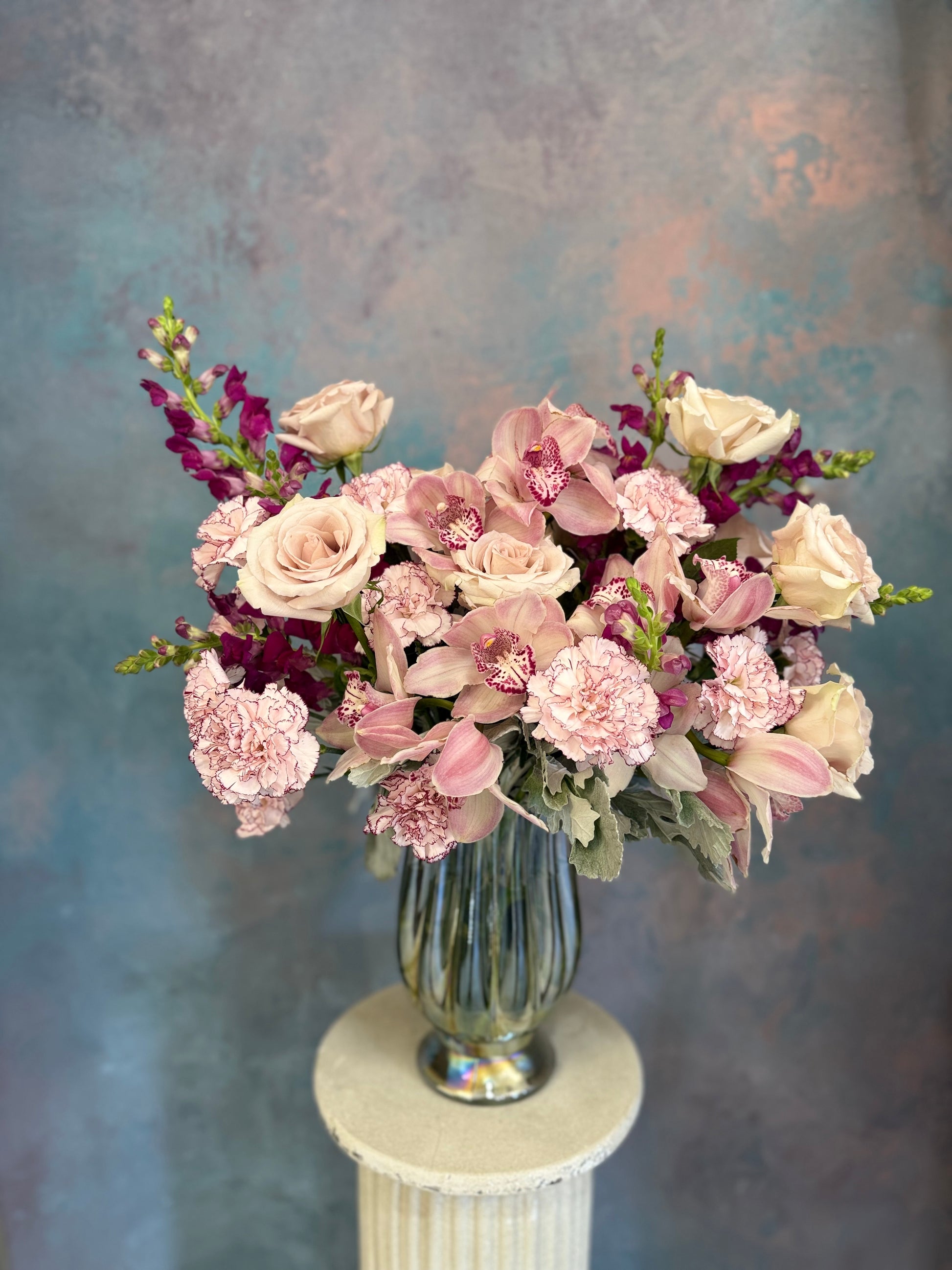 This blush arrangement is a love letter in floral form. Gentle hues, lush textures, and a thoughtfully styled vase come together to create a romantic design that feels both heartfelt and refined — perfect for celebrating love in all its forms.